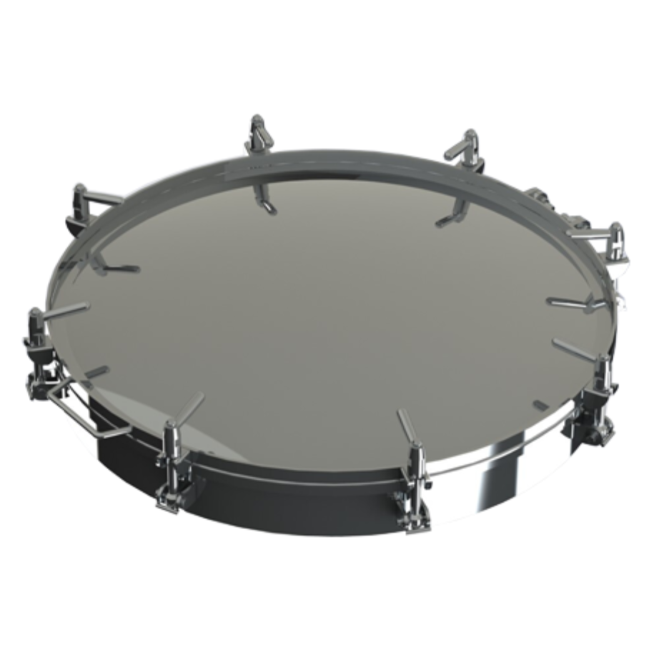 Круглий люк P22-800 — це масивна, велика конструкція (DN800), пристосована до роботи під тиском до 1.0 bar. У базовій конфігурації поверхні люка не піддаються додатковій обробці, помітні зварні шви та сліди механічної обробки. За запитом усі поверхні можуть бути згладжені, а за потреби весь люк проходить процес електрополірування (у результаті отримують однорідну, гладку поверхню).