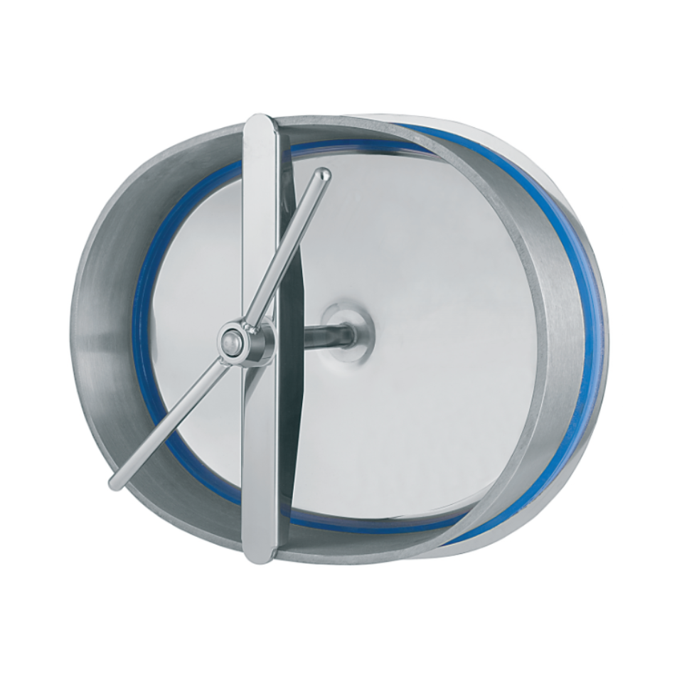 Овальний люк з нержавіючої сталі E156 – це дуже великий люк із міцною, компактною конструкцією, який відкривається всередину резервуара. Крім того, отвір у обшивці резервуара завширшки понад пів метра, що утворюється після відкривання люка, забезпечує вільний доступ до його внутрішнього простору під час сервісного обслуговування або інспекцій. Надійний внутрішній шарнір безпечно утримує кришку люка у відкритому положенні. Цей тип люка оснащують ущільненням, закріпленим по периметру фланця/рами, і монтують у бічну обшивку резервуарів з нержавіючої сталі.