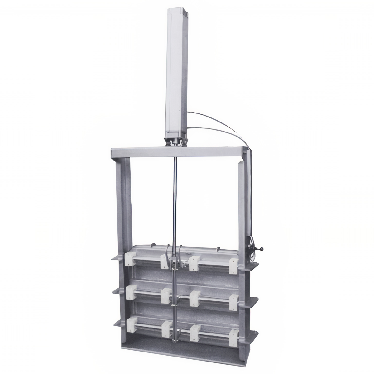 Прямокутний люк з нержавіючої сталі гільйотина E134N — це масивна, міцна конструкція, оснащена підйомною кришкою розміром 600x800 mm. Кришка закріплена в рамі з напрямними, які полегшують її піднімання та опускання. У верхній частині люка передбачено місце для монтажу приводу, що забезпечує піднімання та опускання кришки (привід стандартно не входить до комплекту).